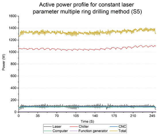 Laser system energy consumption was measured using a Fluke 434 power/energy analyser, which was based on the ISO 14955-1:2017 standard for data collection method [43]. The energy consumptions include those of laser cell, computer numerical control (CNC) motion system, water chiller, computer control system, and function generator for laser pulse control. According to the result, the stepped laser parameter multiple-ring drilling method led to a significant reduction in drilling time and energy consumption, as shown in Table 6. The drilling time was reduced from 247 s to 53 s, which was a 78.54% improvement over that of the constant laser parameter multiple-ring drilling method. The material removal rate in the stepped laser parameter multiple-ring drilling method was 3.58 × 10−7 kg/s, which was higher than that in the constant laser parameter multiple-ring drilling method (7.67 × 10−8 kg/s) due to the increased laser energy input in the inner rings. During the laser drilling process, an increase in hatch distance lead to an increased gap width between each ring. Since the carbon fibre was chopped off by the laser beam between two adjacent rings, the thermal conduction through the fibre to the base material was prevented and the material inside the ring could be considered as an isolated area. When the resin was disintegrated, it lost its ability to hold the fibre. Therefore, chopped fibres were ejected from the drilling area by the argon gas once it was de-bounded from the resin. Hence, the increasing hatch distance was able to increase the material removal rate in the inner rings. Figure 12 and Figure 13 show the active power profiles for the stepped laser parameter multiple-ring drilling method and constant laser parameter multiple-ring drilling method. Since the laser power and pulse frequency were increased for the inner rings in the stepped laser parameter multiple-ring drilling method, the laser power profile showed a jagged shape.