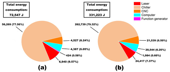 As a result of the reduced drilling time in the stepped laser parameter multiple-ring drilling method, the total energy consumption was also reduced significantly from 331,223 J for the constant laser parameter multiple-ring drilling method to 72,547 J for the stepped laser parameter multiple-ring drilling method, as shown in Figure 14. This is a 78.10% improvement in the total energy consumption. The specific energy consumption to remove 1 kg of CFRP was 1.75 × 1010 J/kg for the constant laser parameter multiple-ring drilling method and 3.82 × 109 J/kg for the stepped laser parameter multiple-ring drilling method calculated from Equation (2). The electricity carbon factor in the UK is 0.2556 kgCO2/kWh [36]. Thus, the carbon emissions from the laser drilling process were calculated form Equation (1), which was 23.52 gCO2 for constant laser parameter multiple-ring drilling method and 5.15 gCO2 for the stepped laser parameter multiple-ring drilling method. It shows that the stepped laser parameter multiple-ring drilling method had a 78.10% reduction in carbon emission.