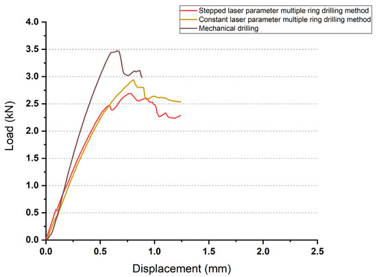 Mechanical fastening is a commonly accepted method to join CFRP workpieces with other materials. The contact force acting between fastener and CFRP material may cause bearing failure. Figure 15 shows an example load versus displacement curve for the CFRP workpiece being drilled via different methods. As the load was applied to the pin, the load and displacement curve was progressed in a linear trend until a sudden drop occurred in the load. The average maximum load was 2.76 kN (±0.10) at a 0.83 mm (±0.15) displacement for the sample drilled via the stepped laser parameter multiple-ring drilling method. In the case of the constant laser parameter multiple-ring drilling method, the average maximum load was 2.97 kN (±0.08) at a displacement of 0.72 mm (±0.15). According to the experimental data, a slight difference (7%) was detected in average maximum load to initiate bearing failure between the two methods. The average maximum load for mechanical drilling was 3.56 kN ((±0.19) at a displacement of 0.60 mm ((±0.07). Moreover, there was no difference in failure mode for the hole being drilled via the stepped laser parameter multiple-ring drilling method, constant laser parameter multiple-ring drilling method, and traditional mechanical drilling process.