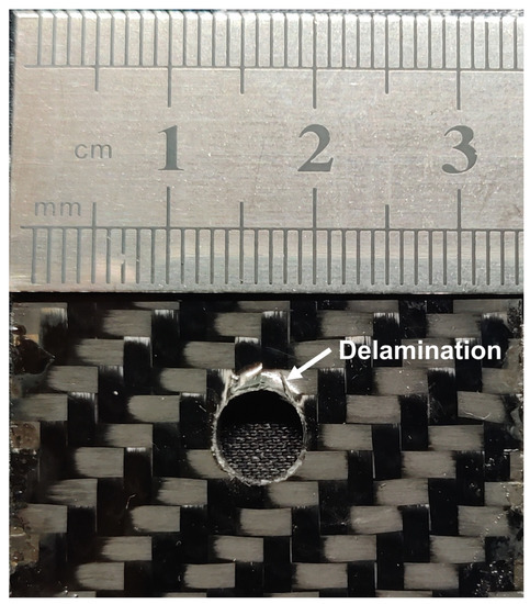The key problem of mechanical drilling is the fibre delamination in the hole exit, as shown in Figure 17, drilled using the same drill bit as shown in Table 5, in addition to the significant tool wear. A good drilling tool can typically drill 20–30 holes in CFRP, depending on the material thickness. Replacement of these tools would result in significant energy consumption and cost.