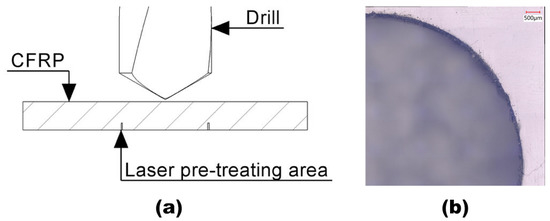 (a) Schematic diagram of combined laser pretreatment and mechanical hole drilling process; (b) Hole exit showing no fibre delamination.