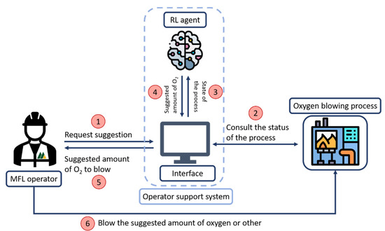 Diagram of the decision process with the assistance of the operator support system (the order of the steps is indicated by the numbers in red circles; oxygen blowing process icon made by Vitaly Gorbachev from www.flaticon.com; accessed 14 April 2021).