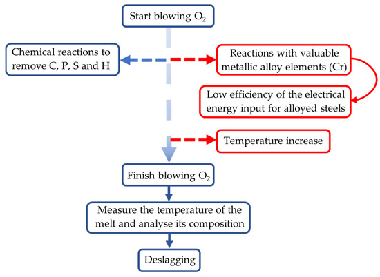 In order to produce the best decision-making process, the agent is focused on the whole oxygen blowing process, as shown in Figure 3. In this process, the oxygen reacts with C, P, S and H to reduce their contents in the melt, and the slag, which contains the liquid and solid oxide impurities, is formed. Nevertheless, blowing oxygen promotes undesired but unavoidable exothermic chemical reactions that further increase the temperature of the melt and cause the loss of valuable metallic alloy elements such as chromium. These unwanted events are presented on the right side of the figure. Moreover, it should be noted that oxygen can be blown more than once until the target content of chemical elements related to the oxygen blowing process is achieved. This occurs after the EAF refining subprocess, because in many cases a complete composition measurement cannot be obtained beforehand and it is not possible to know whether the C, P, S and H contents have been sufficiently reduced, especially the hydrogen content. This repetition of the EAF oxygen blowing process entails reductions in time and material efficiency for the entire EAF process.