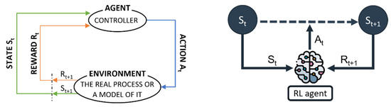 Figure 4 expresses the interaction between an agent and its environment following the MDP structure; that is to say, the agent selects and takes actions () according to how it perceives the environment () and it responds to them by presenting new situations (), which gives rise to rewards () [23]. This reward signal plays the most crucial role in an RL problem because it is the channel whereby the agent perceives how good or bad taking action in state is [24]. These numerical rewards are essential to indicate to the agent what objective it must achieve and not how it must accomplish it. In fact, the agent understands the goal of the problem as maximising the accumulative reward in the long run; that is, it seeks to maximise the expected return ().