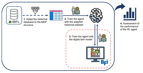 Process to train the RL agent (historical data from MFL and simulated data from BFI; icons made by Becris, Flat Icons, Eucalyp, and Freepik from www.flaticon.com; accessed 14 April 2021).