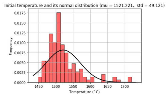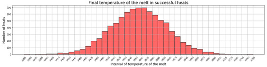 Lastly, the melt temperature at the end of the EAF oxygen blowing process did not increase in excess. The mean value for this temperature was 1556.33 °C, while Figure 14 presents the distribution. Given that only one heat out of the 15,000 heats of the exploitation period exceeded the target tapping temperature, it can be stated that overheating of the melt was avoided. Thus, the achieved improvement was maximal regarding the historical data, where 5% of the heats overheated. The benefit of this is two-fold. On the one hand, time is saved because waiting times for cooling are not necessary, which is crucial to keeping the factory running to schedule. On the other hand, this also shows that the amount of blown oxygen is not excessive and that this material is saved.