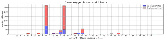 Regarding the blown oxygen, Figure 12 presents the total amount of blown oxygen from the successful heats during the exploitation phase. This figure shows that most heats needed to blow 40 or 45 m3 of oxygen. However, the super-successful target state was most often reached with the first of the two aforementioned rates. Moreover, it can be observed that less than 50 m3 of oxygen was blown in many successful heats. This is in line with the approximation mentioned in Section 3.2 that states that the target amount of oxygen to be blown for medium heats is around 40 m3.