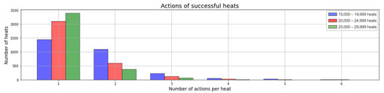 Figure 13 shows the number of actions taken in the successful heats of the exploitation period. This indicates that the majority of heats required one action to end the process successfully. Furthermore, thanks to the three intervals into which the number of successful heats has been divided, it is clear that there is a tendency for the number of heats requiring a single action to reach the target state to increase. Thus, there is room for improvement, and the number of actions could be reduced as the agent gains experience.