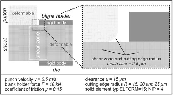 - Nothhaft, K.; Suh, J.; Golle, M.; Picas, I.; Casellas, D.; Volk, W. Shear cutting of press hardened steel: Influence of punch chamfer on process forces, tool stresses and sheared edge qualities. Prod. Eng. 2012, 6, 413–420. [Google Scholar] [CrossRef]