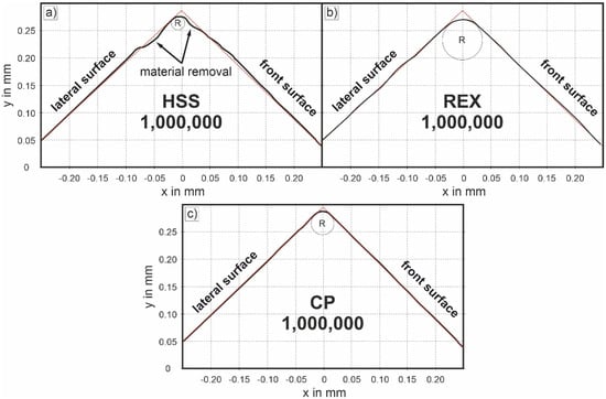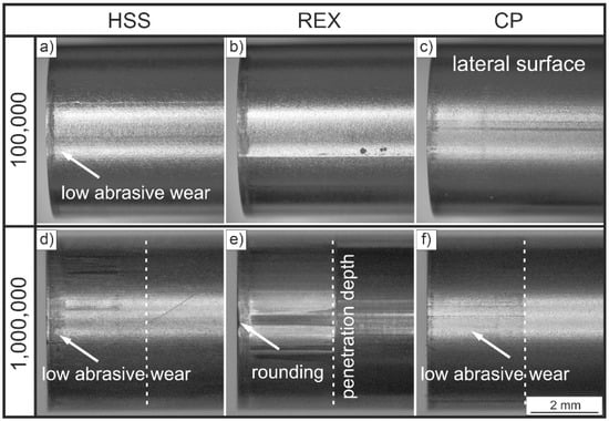 - Increased material removal directly beside the cutting edge led to a reduction of the cutting edge radius in the HSS punches. This corresponds well to numerical simulation results indicating a very high local maximum stress directly beside the cutting edge radius. The weakening of the cutting edge caused by high material removal might lead to an earlier failure of HSS punches at higher stroke numbers in comparison to REX and CP.