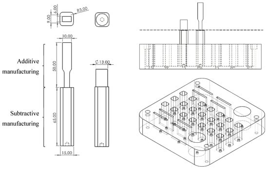 To produce hybrid specimens, solid substrate blocks were designed and manufactured through CNC machining in AW-6082 aluminium alloy for tensile and compressive tests. All substrate blocks were mounted to the pre-machined building platform for the equipment Concept Laser M2 Cusing and fixed with M3 screws (Figure 1). Before starting the production of the additively manufactured part, it was ensured that the surfaces of the machined substrates were perfectly aligned to guarantee proper calibration of the additive manufacturing process []. After a detailed positioning in Magics software, the remaining half specimens were produced by additive manufacturing. Then, all specimens were obtained from the hybrid-built parts by milling.