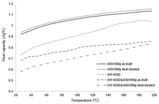 Specific heat capacity evolution along temperature is shown in Figure 2. As expected, specific heat capacity increases with temperature for all cases. AlSi10Mg aluminium alloys have a higher specific heat capacity, mainly in heat-treated samples. Specific heat capacity of AW-6082 is lower. However, the lower specific heat capacity is achieved in heat-treated hybrid samples; a reduction of 38%, compared to additively manufactured AlSi10Mg.