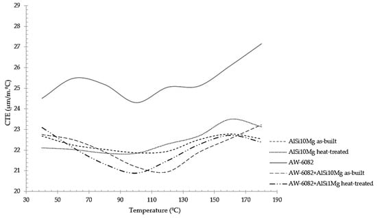 Gumbleton et al. [] evaluated the coefficient of thermal expansion of additively manufactured AlSi10Mg aluminium alloy using microwaves techniques over a temperature range between −267 °C and 177 °C and showed that the material under testing exhibits lower thermal expansion when compared with an equivalent bulk aluminium alloy (~21 × 10−6 °C−1). For higher temperatures, Strumza et al. [] demonstrated that, above 400 °C, the samples showed anomalous thermal expansion attributed to thermally induced porosity, i.e., a process by which the material swells during heating when pores expand under increasing internal pressure. Based on other studies [,,], CTE increases as the temperature increases and there is no dependence on the polar angle up to approximately 120 °C. For higher temperatures, CTE of parts oriented vertically (90°) shows slight upward deviation when compared to the other orientations.