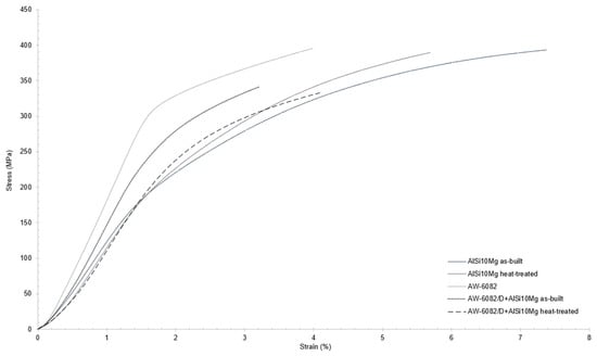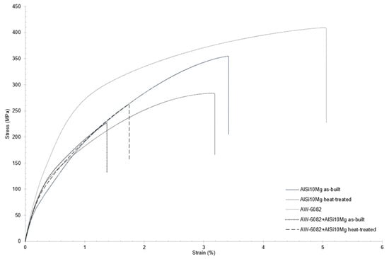In this work, tensile properties of AlSi10Mg as-built and heat-treated, AW-6082 and hybrid specimens as-built and heat treated were determined through uniaxial tests carried out in the Instron 5969 Universal Testing System (Massachusetts, EUA) using a strain extensometer. In each case, five specimens were tested at 1 mm/min with a 50 kN load cell at room temperature. ASTM E8 standard [] was followed and the results are compiled in Figure 4 and Table 5.