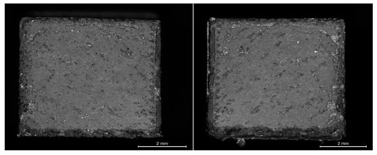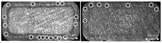 By the images acquired with the Leica DM500 reflection microscope after rupture in the tensile tests, differences are visible in the specimen shell (Figure 12) which, after heat treatment, appears to have fewer voids (white circles in Figure 12). This result, similarly reported by Tradowsky et al. [], caused an improvement in mechanical properties when heat treatment was applied, as reported in Section 3.3.
