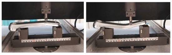 The main mechanical loading applied to the crankset is bending. Therefore, a three-point flexural test, combining tensile and compressive loads, was done on the original AW-6082 aluminium crankset. Tests were conducted on a Shimadzu AGS-X universal testing machine with a load cell of 50 kN, at a constant crosshead rate of 1 mm/min. The fixed supports were located 110 mm to the left and 35 mm to the right of the load application point and the test stopped when the displacement was maximum, as shown in Figure 8.