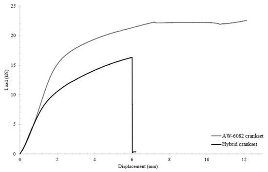 Load–displacement curves for AW-6082 and hybrid cranksets.