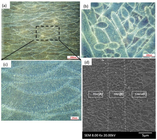 Optical micrographs of as-built AlSi10Mg alloy: (a) longitudinal section at low magnification; (b) transverse section; (c) longitudinal section at higher magnification; (d) SEM image of transverse section at higher magnification with heat-affected zones.