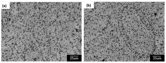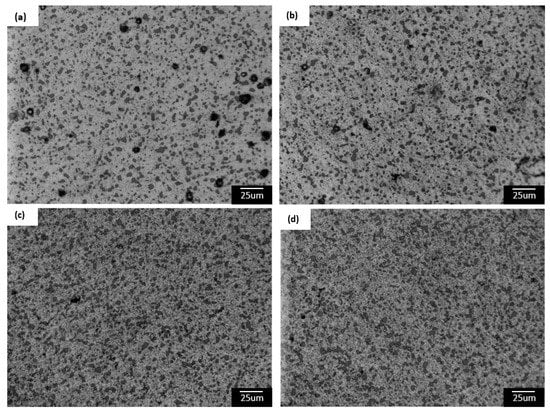 Microstructures of the solution-treated specimens at 540 °C for 6 h were observed under the optical microscope as provided in Figure 3, which shows a uniform microstructure completely devoid of the track segment morphology in both longitudinal and transverse sections. The uniform distribution of Si particles is clearly noticeable in the microstructure, mainly because of the spheroidizing of the eutectic phase during the heat treatment according to the Ostwald ripening mechanism []. The microstructure coarsened, causing Si to diffuse out to form second phase particles instead of clustering at grain boundaries of α-Al. The highly saturated Al matrix causes excess Si to precipitate out, which is readily influenced by the high temperature during the solution treatment. Upon solution treatment, the continuous network of eutectic Si walls is broken down, ultimately causing residual Si atoms dissolved in the Al matrix to be precipitated out after quenching [].