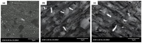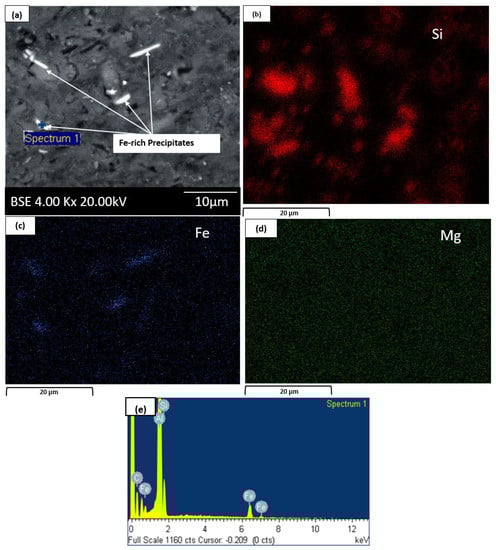 To investigate the distribution of Al and other alloying elements, EDS area mapping was performed on the solution heat-treated specimens. The BSE image and its corresponding elemental maps of Fe, Si, and Mg are shown in Figure 4. It is inferred from the elemental maps that Si is locally distributed, and Mg is uniformly distributed in the matrix. The elemental analysis also identified the slender needle-shaped brighter precipitates with a high concentration of Fe (marked by the arrowhead) as shown in the results in Figure 4a. Spot analysis on these brighter precipitates as shown in Figure 4e also indicates the presence of Fe in them. Intermetallic particles form due to the presence of Fe in the alloy’s chemical composition as reported in Table 1. Heat treatment induces diffusion and segregation of Fe and Si atoms leading to the formation of Fe-rich precipitates and random distribution of Si particles in the aluminum matrix [].