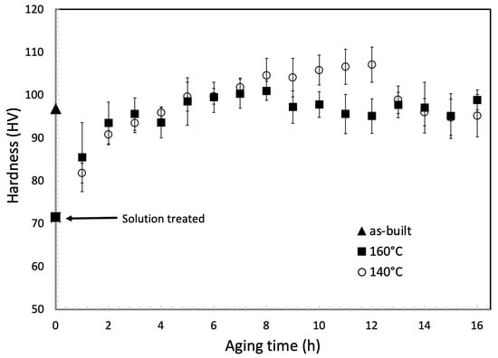 A conventional T6 post-build heat treatment was carried out for the coupons. Specimens were solution treated at 540 °C for 6 h followed by water quenching, this duration was chosen as most works were done at 1–2 h [,,] and hardness has been found to increase with time due to solid solution strengthening that occurs when a supersaturated solid solution is developed during the solution treatment stage and preserved by rapid quenching. Further explanation on this is provided in the discussion section. The solution-treated samples were artificially aged at 140 °C and 160 °C for 1 to 16 h and water quenched to preserve the final microstructure.