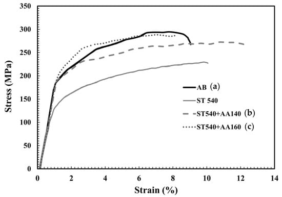 Stress–strain curves, YS, UTS and Elongation at break for (a) as-built (b) ST + AA at 140 °C for 12 h (c) ST + AA at 160 °C for 8 h.
