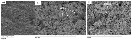 Both artificially aged samples showed similar fracture surfaces with dimple structures, indicating the presence of micro-voids to be the initiator of ductile failure as shown in Figure 9b,c. However, the significant differences in ductility values could be explained due to the distribution and quantities of pores, which appear much higher in the AA 160 °C samples thereby impacting the ductility of the specimen []. Segregation of Si particles into randomly distributed spheroids where voids can nucleate promoting void coalescence and thereby leading to crack propagation resulted in specimen failure under tensile loading in heat-treated specimens [].