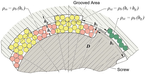 BZ and BS are dimensionless values which resemble the proportion of non-grooved barrel and the proportion of the screw flight in the cross-section area, respectively. is the bulk density between the screw and the inner barrel diameter, is the bulk density between the screw and a groove and is the bulk density between the screw flight and the groove. The latter means that the dumping height is equal to the groove depth.
