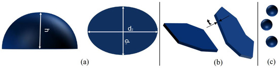 Three different polyolefins were chosen, since they are frequently processed in an industry with extruders that possess a grooved solid conveying zone. The three materials primarily differ with regard to their particle shape. As a virgin lenticular granule, Moplen EP440G from the company LyondellBasell, Rotterdam, the Netherlands was used, which is a polypropylene (PP) copolymer for extrusion blow molding applications. The regrind material was a PP exhibiting a plate-like shape. Since this material was previously used in an industrial flat-sheet extrusion process, the exact material composition and specifically its tradename is unknown. The chosen powdery plastic is Lupolen 5461 B Q471, which is a high-density polyethylene (PE) from the company LyondellBasell, Rotterdam, the Netherlands, that can be used for the extrusion of peroxide crosslinked pipes. The different plastic shapes are schematically depicted in Figure 2 and labeled with the geometric dimensions. Pictures of the three materials can be found in Figure 3.