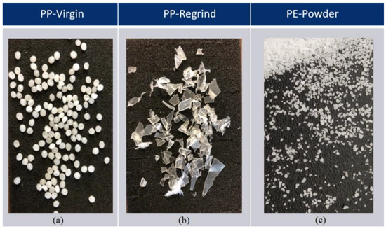 Schematic representation of (a) the lenticular virgin PP, (b) the irregularly shaped regrind PP and (c) the powdery PE.
