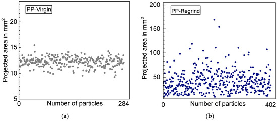 The regrind PP material was examined with regard to its particle thickness t for 100 different flakes. The mean thickness amounts to 0.46 mm ± 0.37 mm. The mean projected area is 42.3 mm2 with a large relative standard deviation of 54%, as can be seen in Figure 4b. The large deviations in particle thickness as well as in the projected area make clear that the regrind material exhibits a very inhomogeneous particle shape (see Figure 3) and size (see Figure 4).