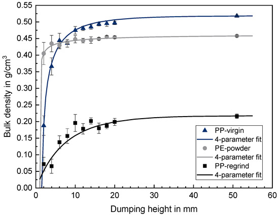 Bulk density measurements for increasing dumping height and respective 4-parameter-fits for the virgin PP, the regrind PP and the powdery PE.