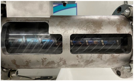 In order to observe the solid conveying, especially with regard to an expected mass transport in the grooves, transparent duplicates of the three steel barrels were manufactured using poly(methyl methacrylate) (PMMA). The transparent PMMA barrels were only used for optical observation without conducting throughput measurements because they possess different friction conditions between the processed material and the barrel wall. The helically grooved PMMA solid conveying zone was plugged into a surrounding steel casing with two observation windows, as can be seen in Figure 6. The recorded videos of processing the different materials with the grooved transparent PMMA barrels can be made available on e-mail request (see Supplementary Materials).