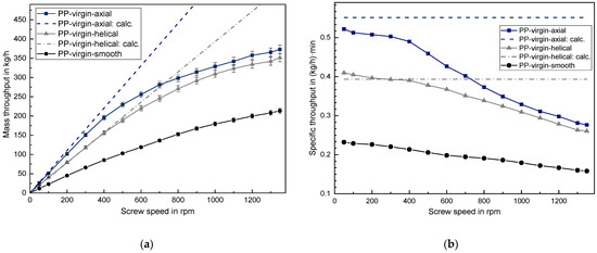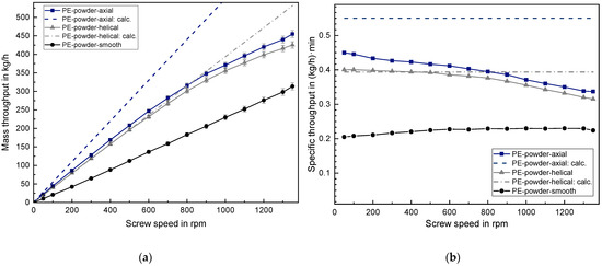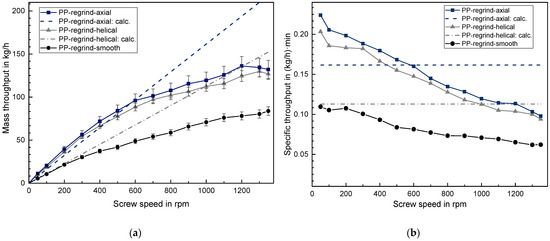 The results of measuring the mass throughput for the powdery PE are depicted in Figure 10. The respective measurements show a very low deviation between independent series of experiments in each case, which results in small error bars. The specific throughput at low screw speeds between 50 and 300 rpm is around 0.43 (kg/h) min for the axially grooved barrel, around 0.40 (kg/h) min for the helically grooved barrel and approximately 0.21 (kg/h) min for the smooth barrel.