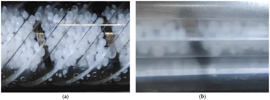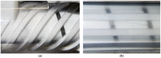 Pictures of processing the powdery PE in a helically and an axially grooved PMMA barrel are shown in Figure 12a,b, respectively. For the helically grooved PMMA barrel, a proper nut–screw conveying is observed. Specifically, the powdery PE exhibits a quasi-ideal block flow. Furthermore, a mass conveying in the grooves is observed, whereby both the powder in the grooves and in the screw channel exhibit a solid conveying angle that is equal to the groove angle. This explains the good agreement between the measured and the calculated throughput in this case.