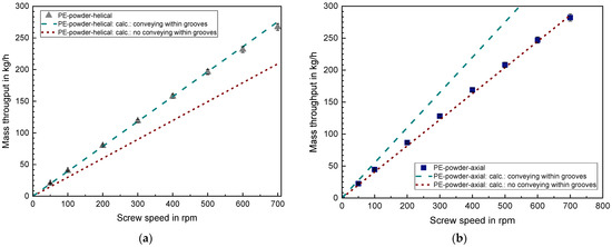The mass throughput is always predicted by using Equations (7)–(9). This includes the throughput in the screw channel according to Equation (7) and the throughput in the grooves according to Equation (8). Since a nut–screw conveying is assumed, the solid conveying angle is supposed to be equivalent to the groove angle, which is 41.19° for the helically grooved case and 90° for the axially grooved case. This is purposely created at this point without a further discrimination into the four different solid conveying cases. A detailed discussion hereto is found in the proceeding work. The three different bulk densities (, and ) for each material are given in Table 1 and the free cross-sectional area of the screw channel and of the grooves are given in Section 2.2.
