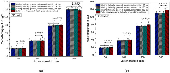 For the virgin PP, the throughput of the mere helically grooved solid conveying zone is nearly identical to the throughput of the entire extruder set-up. There, the maximum relative deviation amounts to 2.6% at a screw speed of 300 rpm, which can be attributed to a small uncertainty of measurement.