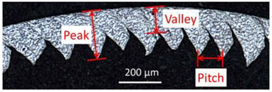 During the tests, cutting force Fc (along the X-direction) and thrust force FT (along the Z-direction) were measured by a piezoelectric dynamometer, Kistler model 9119AA2, together with a charge amplifier, Kistler model 5019B. Moreover, the chips and machined workpieces were collected for further analysis. Chips were prepared for the metallographic analysis as described in the standard ASTM E3-11 [35]. They were mounted in the cylindrical moulds of thermoplastic polymers, and underwent heat and pressure during the moulding cycle. Then, they were ground and polished until a scratch free surface was obtained. Finally, they were etched using Kroll chemical solution to reveal the microstructure. After polishing and etching, the samples were observed in the optical microscope to measure the chip geometry. Figure 2 shows the serrated chip morphology typical of machining Ti-6Al-4V titanium alloy. This figure shows the chip parameters: peak, valley and pitch. Peak is the maximum chip thickness, valley is the minimum chip thickness, and the pitch is the distance between two adjacent peaks. To ensure a good repeatability, each chip geometry parameter was measured 5 times for each cutting condition in a single chip sample, representative of such condition.