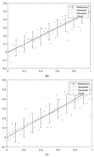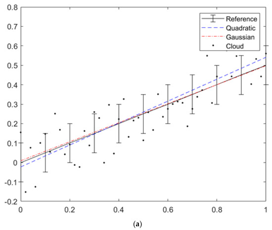 To make a preliminary analysis, different data points were generated by considering and . The above-described statistical approach is compared with the usual least-squares approximation, as shown in Figure 3. In order to show the procedure performance for three different situations, three different couples (a, b) have been randomly chosen, as represented in Figure 3a, Figure 3b, and Figure 3c, respectively. For each couple (a, b), the reference solution consists of a linear model using considered parameters a and b. Then, a set of data points is distributed around that linear solution by using a random distribution with zero mean value and a standard deviation, represented by the bars in the figures. When constructing the regression, according to the procedure just described, the minimization procedure proceeds from the generated data, while ignoring its origin, computing two linear regressions (red and blue) based respectively on Gaussian and classical least square minimization. The just described procedure is easily generalized for addressing multi-parametric regressions with richer nonlinear regressions.