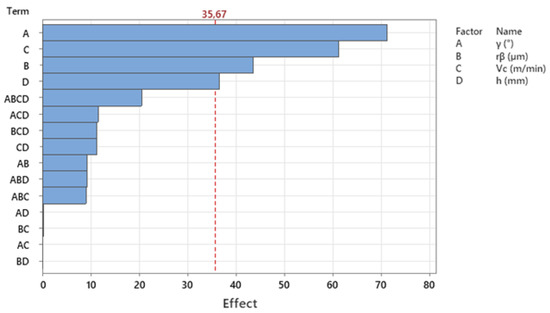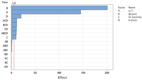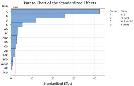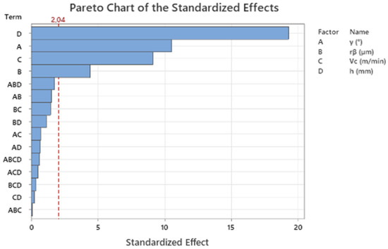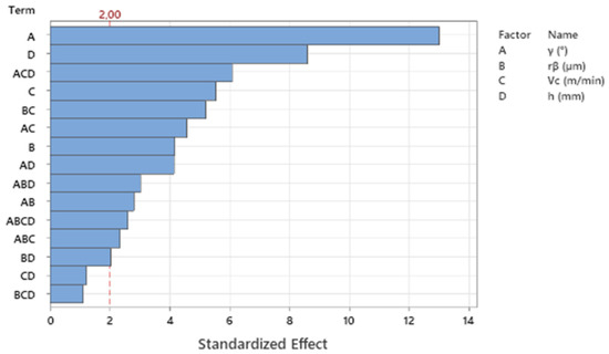 A DOE analysis is performed using the Minitab statistical software. The forces results are used to construct a mathematical (regression) model of the forces (Fc and Ft). To get a compact model equation, the significant factors (cutting parameters) and their interactions are identified using Pareto analysis, as shown in Figure 4 and Figure 5. As shown in Figure 4, the significant factors affecting the cutting force Fc are γn, rn, Vc and h. The interactions between these four cutting parameters do not show any influence on Fc. As shown in Figure 5, the thrust force Ft is also affected by the same parameters affecting Fc, as well as some of their interactions, including the two-way interactions: γn × h, Vc × h, Vc × rn, and rn × h, and the three-way interactions: γn × h × rn. However, the influence of these interactions on Ft is very small compared to the main factors. Therefore, the regression models of the forces should exclude the interactions between the factors, without compromising the precision of the models. These models are represented by the following equations: