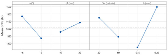Influence of the cutting parameters on the cutting force (Fc) based on all cutting conditions.