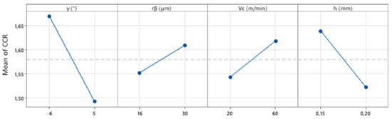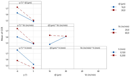 The graphical representation of the influence of the cutting parameters on the CCR is shown Figure 9 and Figure 10. The empty slots in Figure 10 represent some interactions that are not relevant according to the Pareto analyses. These figures show that CCR decreases as the tool rake angle (γn) and uncut chip thickness (h) increase, and it increases with the tool edge radius (rn) and cutting speed (Vc). Compared to the forces, the influence of the cutting parameters on the CCR is the same concerning the tool geometry (γn and rn), but opposite concerning the cutting regime parameters (cutting speed and uncut chip thickness).