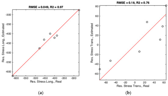 To obtain the (predicted) residual stress at the machined surface for the remain cutting conditions, the ML algorithm based on the mathematical regression analysis presented in Section 3 is applied using the data shown in Table 8. It consists of a four-dimensional regression of low degree, because of the reduced number of data and the potential error that the data involve. As soon as the regression is obtained, by using the dataset (training set), as reported in Figure 11 with the accuracy indicators (RMSE et R2 indexes), and the standard deviation extracted from the distance from the data points to the regression prediction. The predictions are performed in the conditions where residual stresses were not measured, while indicating the corridor defined by plus and minus two times the standard deviation (Figure 12). The obtained regression equations are represented by: