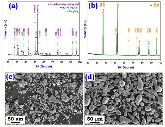 - Shadangi, Y.; Shivam, V.; Singh, M.K.; Chattopadhyay, K.; Basu, J.; Mukhopadhyay, N. Synthesis and characterization of Sn reinforced Al-Cu-Fe quasicrystalline matrix nanocomposite by mechanical milling. J. Alloys Compd. 2019, 797, 1280–1287. [Google Scholar] [CrossRef]