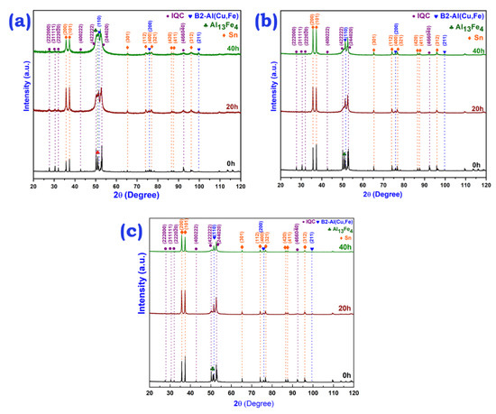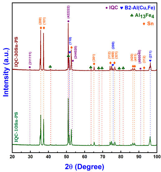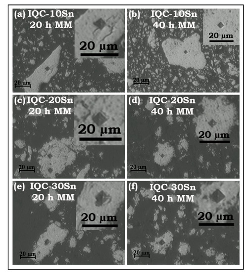 - After milling, the Al-Cu-Fe IQC phase transforms to the Al13Fe4 and B2-type Al (Cu, Fe) phases. However, the phase fraction of Al13Fe4 and B2-type phases formed after MM is dependent on the volume fraction of Sn reinforcement in the IQC-Sn nanocomposite powder.