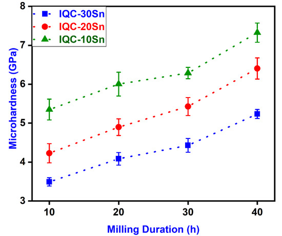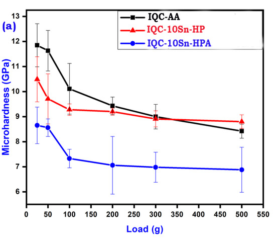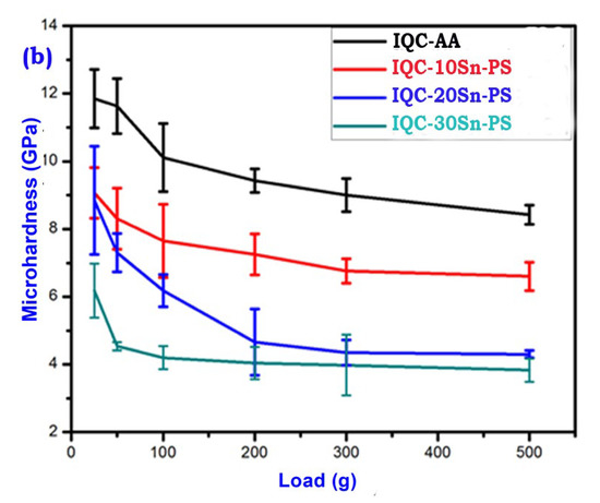 - The microhardness of the hot-pressed sample (IQC-10Sn-HP) at 200 g load was found to be ~9.2 GPa. However, the pressureless-sintered composite has a lower microhardness value than that of the hot-pressed sample at a 200 g load.