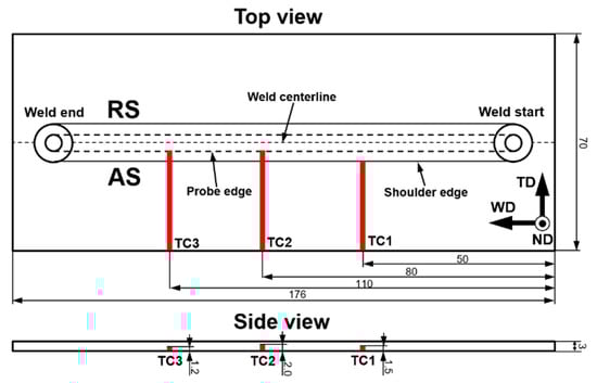 Thermocouples layout inside the workpiece (unit: mm). T1, T2 and T3 show thermocouples used for the temperature measurements in the heat-affected zone, upper section of the stir zone, and bottom section of the stir zone, respectively. WD, the ND and TD refer to welding direction, normal direction and transverse direction, respectively; AS and RS refer to advancing side and retreating side, respectively. Not in scale.