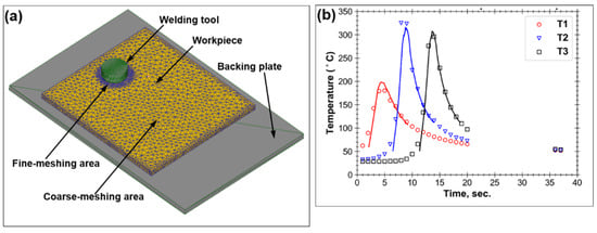 (a) The utilized FEM model and (b) a typical comparison of the measured (symbols) and simulated (solid lines) temperature-time profiles for thermocouples T1, T2 and T3. In (b), the data for 750–380 weld are shown.