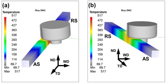 It has been shown that the tool shoulder plays a major role in the generation of FSW heat [16]. Accordingly, the welding temperature normally decreases towards the weld root [7,8,16,17,18,19,20,21,22,23]. In contrast, the temperature distribution in the width direction of the stir zone is often found to be nearly symmetric [8,11,19,24,25,26,27]. In many cases, however, a slightly increased temperature (~10–20 K) is predicted on the advancing side (AS) [5,8,9,16,17,18,23,28,29,30]. This asymmetry is sometimes attributed to a slight variation in the contact conditions at the tool/workpiece interface due to a tool tilting effect [31].