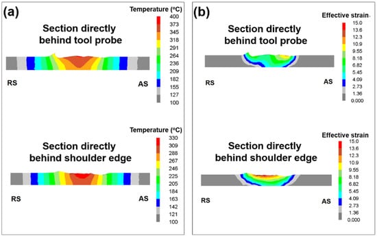 Typical 2D distributions of temperature and cumulative effective strain for both the above sections are shown in Figure 4, while the entire data set is given in supplementary Figures S3–S9. The temperature distributions were found to be relatively broad and virtually encompassed the entire workpiece (Figure 4a). On the other hand, the strain distributions were comparatively narrow (Figure 4b). In both examined sections, the peak magnitudes of the thermomechanical characteristics were typically found in the upper section of the stir zone (Figure 4), thereby confirming the primary role of the tool shoulder in the generation of heat and strain. Within this area, however, strain distributions were not uniform (Figure 4b), thus presumably reflecting the complex character of material flow in the near-surface region.